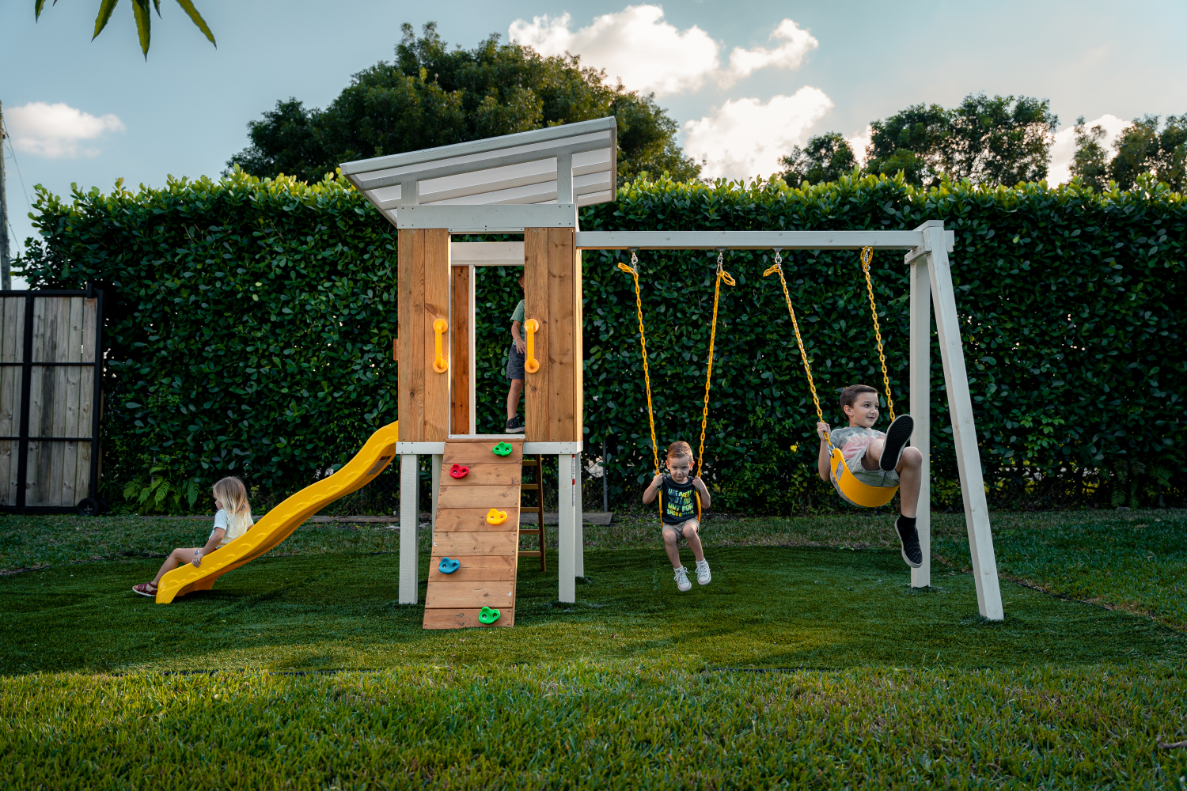 Avenlur's Modern Backyard Discovery & Adventure Swing set and Fort encourages hours of active, engaged playtime with a variety of activities in your own backyard! Avenlur wooden swing set features swings for 2 kids at one time, Playhouse, a place for a sandbox, with a swing set ladder and rock climbing wall to reach the raised, play fort and race down the slide. Everything you need to create the perfect play-safe swing set experience in a single day!