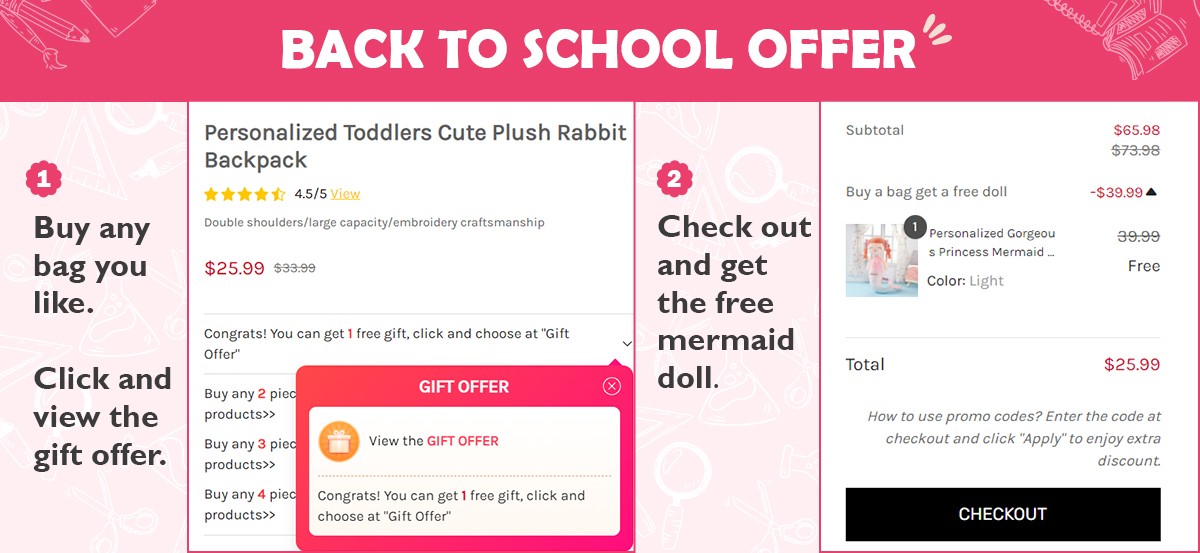 Buy any bag you like and you can get a FREE mermaid doll. Please note that you should ADD THE GIFT TO YOUR CART and check out together, or else you can't get the free doll.