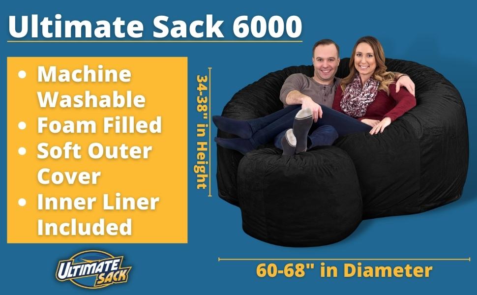ULTIMATE SACK 6000 w/ FOOTSTOOL - has material measuring approximately 6 feet in diameter. Depending on the surface of the floor and weight of the occupant, the bean bag chair will be between 60 and 68 inches across, and 34-38 inches in height when fully fluffed. The bean bag chair weights 65-70 pounds. Includes a removable, washable cover. Comes with an unbeatable 10 Year Manufacturer Warranty. Leaves Warehouse in 1-4 Days.